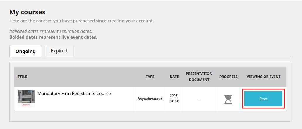 When the list of your trainings appears, select the one you wish to view and click the “Start” button.