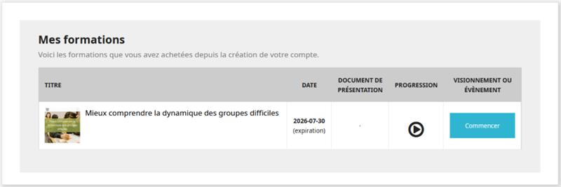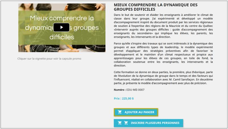 Une fois connecté, vous pouvez procéder à l'achat d'une formation. Pour ce faire, sélectionnez la formation que vous souhaitez acheter. Pour cet exemple, nous allons prendre la formation Mieux comprendre la dynamique des groupes difficiles.