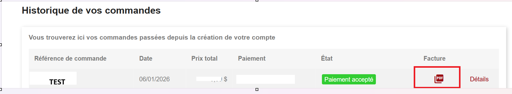En cliquant sur l’icône PDF associée à votre commande, vous pourrez télécharger votre facture directement depuis cette section.